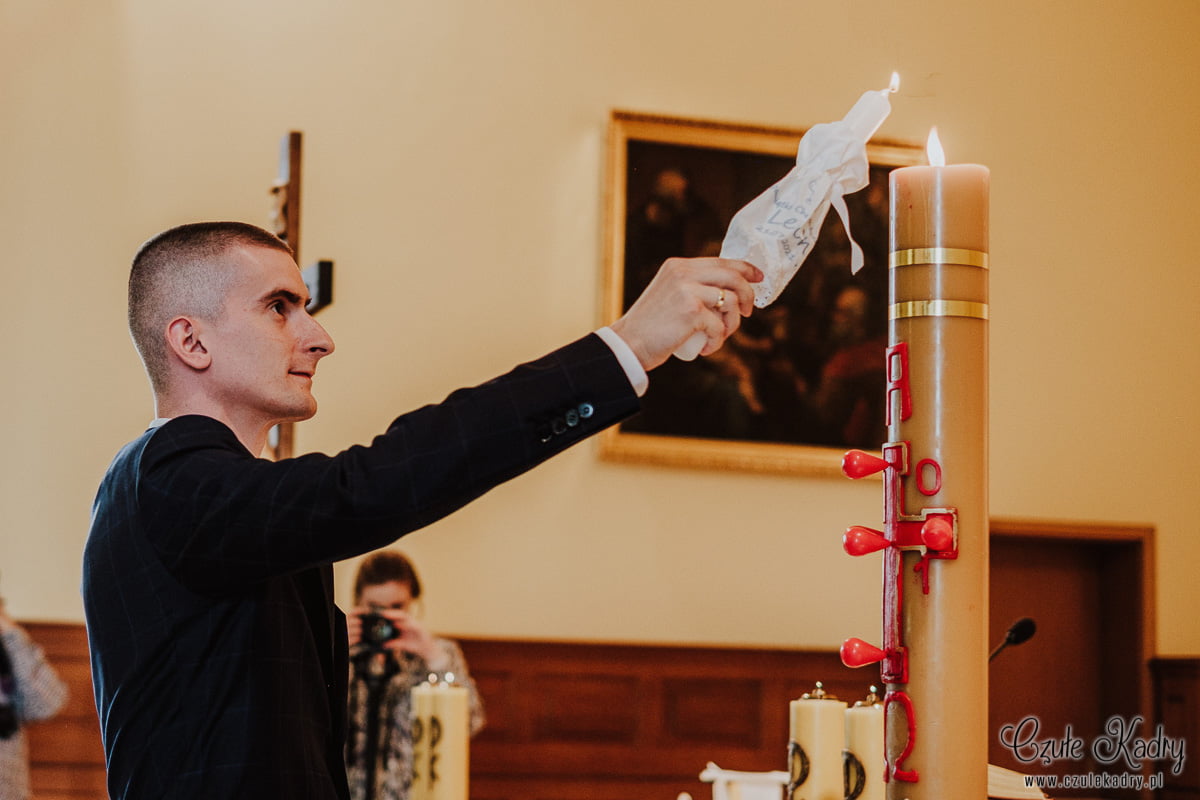 Pewnie myślicie, że już niezwykłego nas nie czeka? Nic bardziej mylnego. Spodziewalibyście się, że w trakcie Mszy, na której będziemy świadkami sakramentu małżeństwa, będzie również chrzest? Leon dostąpił Chrztu Świętego właśnie w tym uroczystym dniu! Przydało się nam nasze tegoroczne doświadczenie z reportażami z chrztów, bo, trzeba przyznać, jest to momentami bardziej wymagająca dziedzina fotografii niż uwiecznianie ślubów. Dlaczego? Wiecie, jak trudno jest czasem uchwycić każdy symboliczny gest, który ma miejsce w trakcie tej krótkiej, a jak ważnej ceremonii? Naturalnie, najważniejszym momentem jest polewanie główki dziecka, potrafiące czasem trwać tylko kilka sekund! Na szczęście, działając w duecie łatwo jest przygotować się do uchwycenia tego, co najważniejsze, zarówno na reportażu ślubnym, jak i z chrztu.