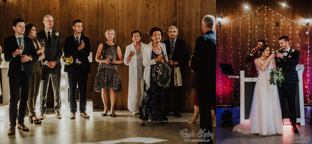 Po pięknej, katolickiej mszy (powiemy Wam, że wiele zależy od księdza w tym względzie!) w podwarszawskim Józefosławiu, nadszedł czas na wesele. Gajówka Obręb – co za przestrzeń! Duży, drewniany budynek, z ogrodem nieopodal, sąsiadujący z ogromnym polem równo ściętej trawy, otoczonej murem z drzew, nad którymi zachodziło potem złociste słońce, żegnając radości i troski minionego dnia.