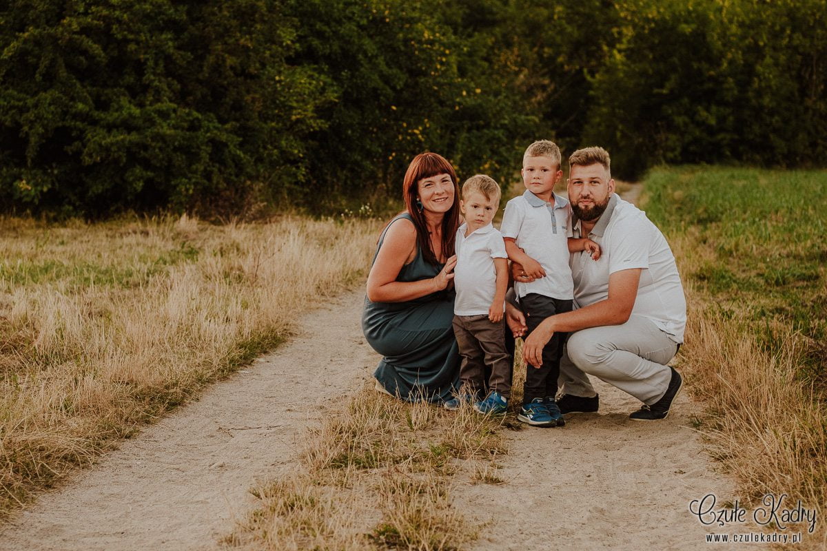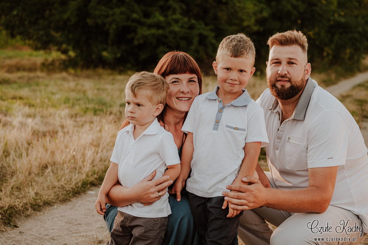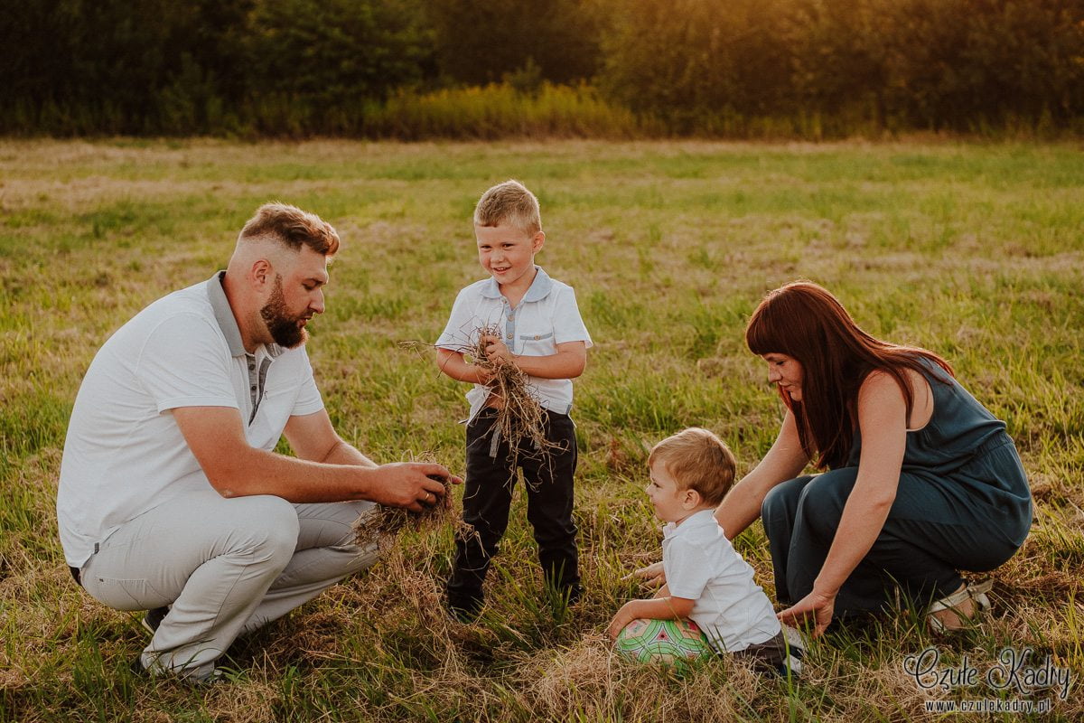 Współpraca z maluchami w wieku lat kilku zawsze jest wyzwaniem, bo nigdy nie wiemy, czego się spodziewać. Każde dziecko ma inny temperament, na rodzinnej sesji zdjęciowej oswaja się z obiektywem wolniej lub szybciej, chce pozować lub nie chce pozować wcale. Jest to zawsze wielka niewiadoma. A kiedy dzieci jest dwoje lub więcej – wtedy dopiero jest zabawa! ;) Synowie Eweliny okazali się „żywym srebrem” – idealnym „materiałem” do sesji rodzinnej lifestyle – czyli mało było pozowania, dużo ruchu, dużo swobody. W takim przypadku mało ingerujemy w przebieg sesji, rzucamy raczej dzieciom i rodzicom luźne pomysły, co do tego, co mogą robić. Ta rodzinna sesja zdjęciowa wyszła bardzo naturalnie, chłopcy grali z tatą w piłkę, biegali po łące, wygłupiali się z rodzicami. Mamy nadzieję, że był to dla nich radośnie spędzony czas. Mimo, że sesja rodzinna lifestyle rodziny Eweliny trwała dość krótko (ok. 40 minut, o ile dobrze pamiętamy), powstało wiele ciepłych, rodzinnych ujęć.