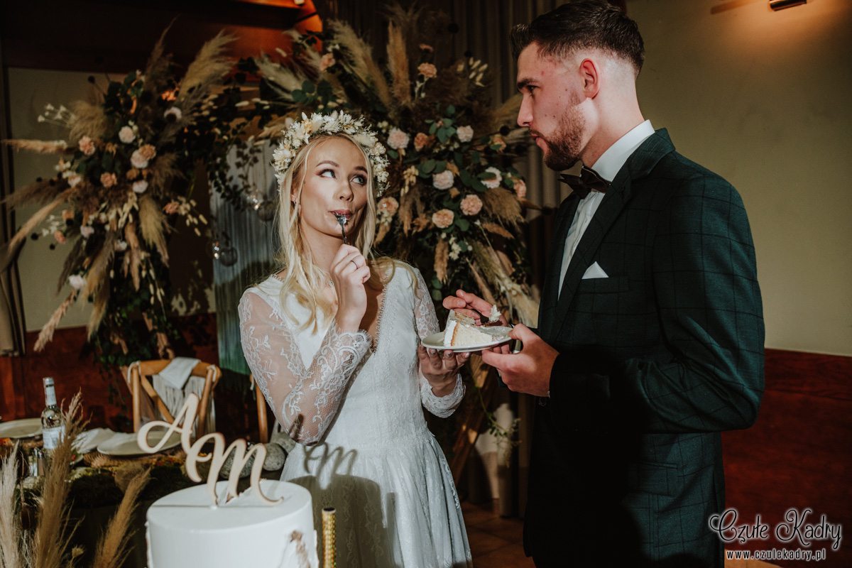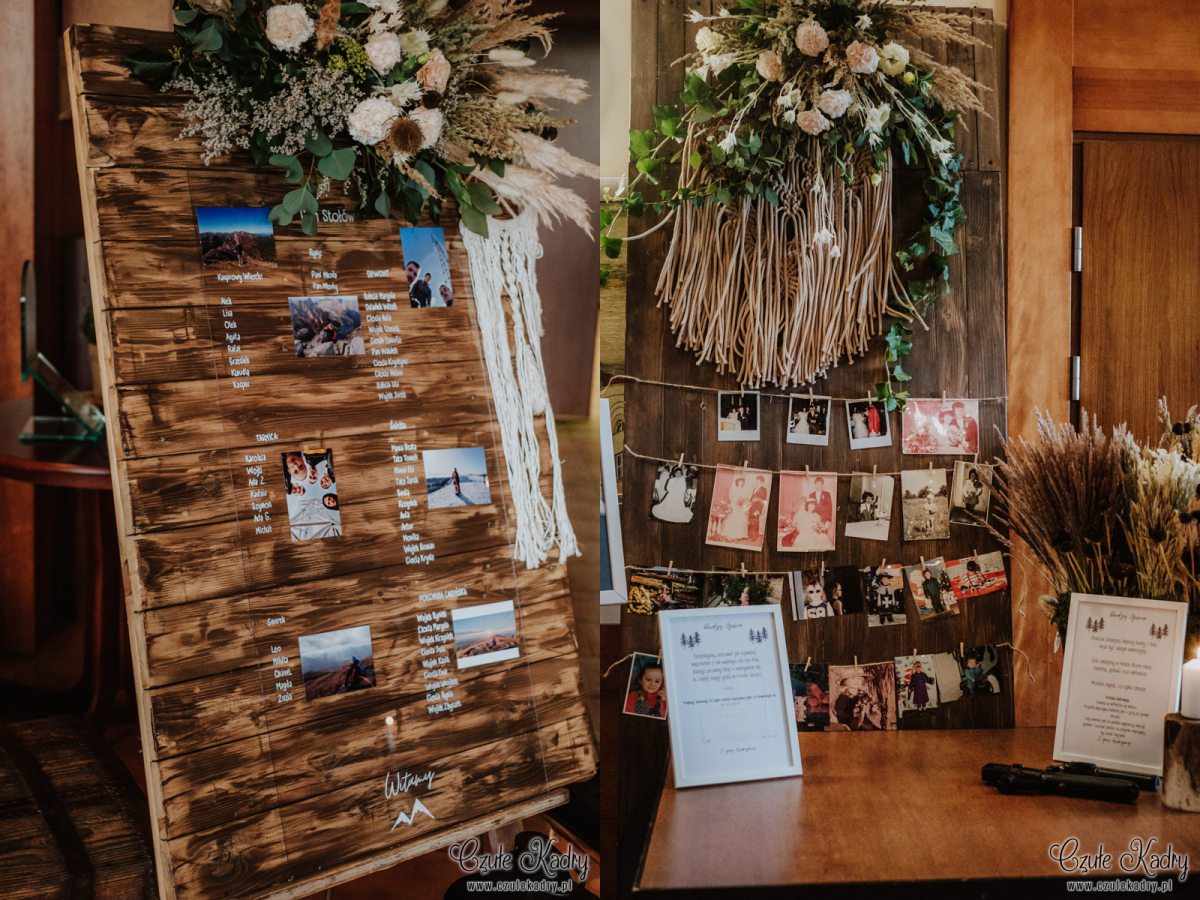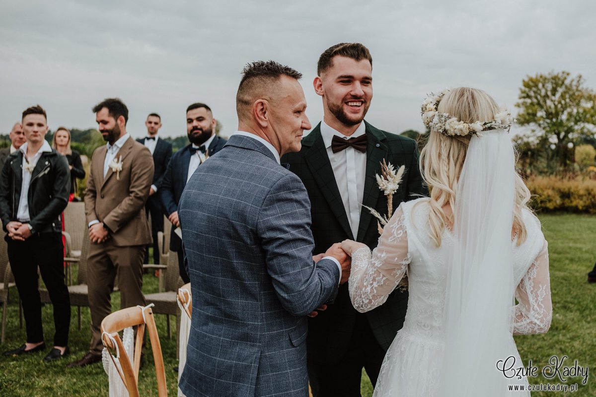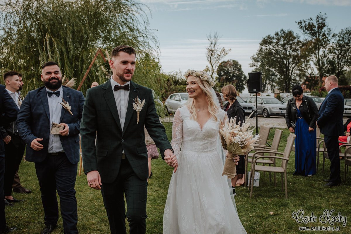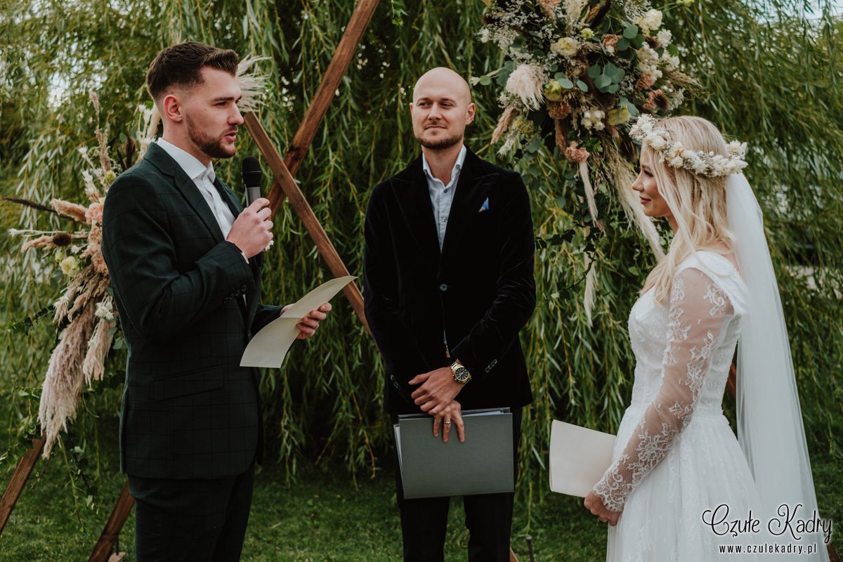 Ceremonia odbyła się w malowniczym miejscu, przy boho ściance nieopodal sali weselnej, gdzie Para Młoda mogła cieszyć się pięknymi widokami i bliskością natury. Mimo, że pogoda była pochmurna, to deszcz na szczęście nie przeszkodził Atinie i Michałowi w przeżyciu wyjątkowego dnia.