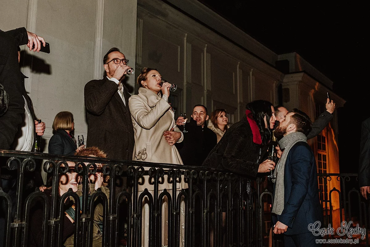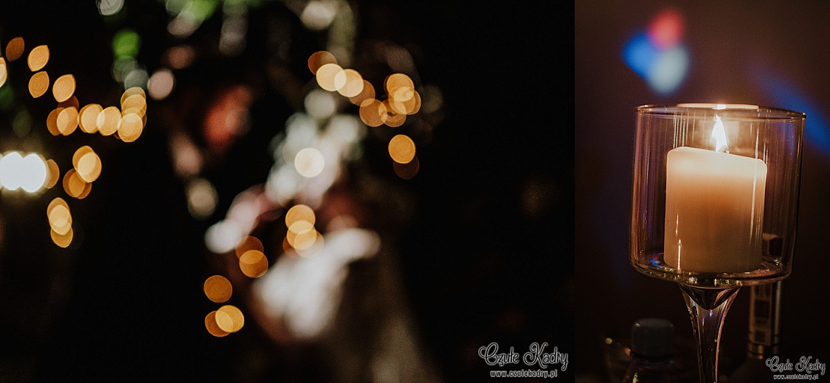 - Niepowtarzalny klimat – zimowe śluby mają niesamowitą atmosferę, zupełnie inną od tych w sezonie. Dlaczego? Sami nie wiemy. :D Być może jest to kwestia innego oświetlenia, kolorowych lampek na ulicach oraz w kościele, świeczek na sali, czy tego, że wychodząc z kościoła i dojeżdżając na salę weselną praktycznie zawsze jest już całkiem ciemno. A może ze względu na temperaturę na zewnątrz wytwarza się wśród Was i gości wyjątkowo ciepła atmosfera. ;) Dodatkowo, to, że wszyscy goście chcą być cały czas (lub znaczną większość) w środku, na sali (bo jest za zimno, by przechadzać się długo po ogrodzie), powoduje, że parkiety na zimowych weselach są zazwyczaj ciągle pełne tańczących par! Co więcej, jeśli rozważacie ślub w Święta Bożego Narodzenia, czy wesele w Sylwestra to odświętny nastrój i magia robią się praktycznie same.